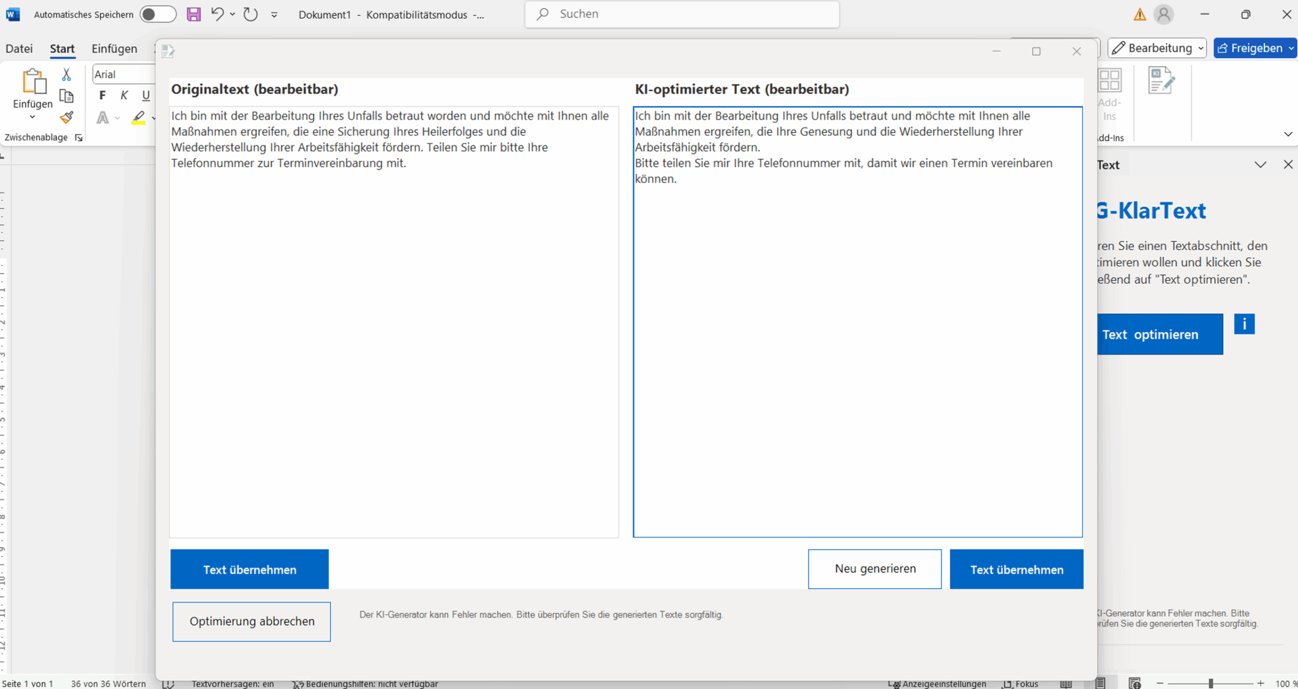 Recht pragmatisch kommt hier das KI-gestützte Word-Add-in daher, das die Verwaltungs-Berufsgenossenschaft (VBG) in einem Vortrag bei der re:publica vorgestellt hat (und das übrigens bald als Open Source veröffentlicht werden soll). Das Ziel ist hier, Bescheide oder andere Schriftstücke der Verwaltung verständlicher zu formulieren und so Barrieren abzubauen. Dazu generiert das Tool bei der Texterstellung alternative Formulierungsvorschläge. Hier liegt die „Letztentscheidung“ immer noch beim Menschen.