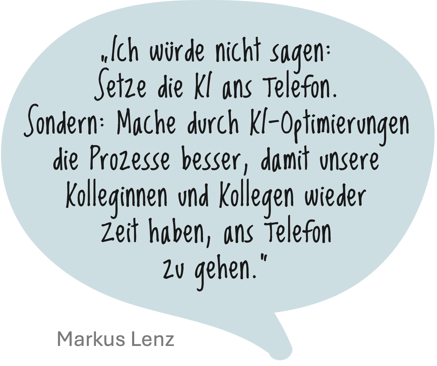 „Ich würde nicht sagen: Setze die KI ans Telefon. Sondern: Mache durch KI-Optimierungen die Prozesse besser, damit unsere Kolleginnen und Kollegen wieder Zeit haben, ans Telefon zu gehen. Wenn ein Steuerzahler anruft, dann soll er auch jemanden ans Telefon bekommen.“