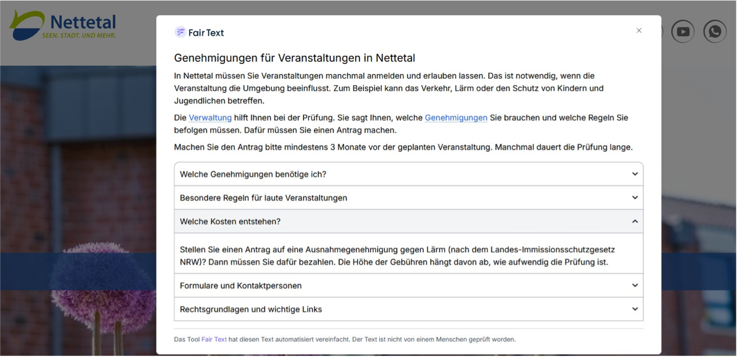 - Übersetzung in leichte Sprache (z.B. FairText der Stadt Nettetal)
