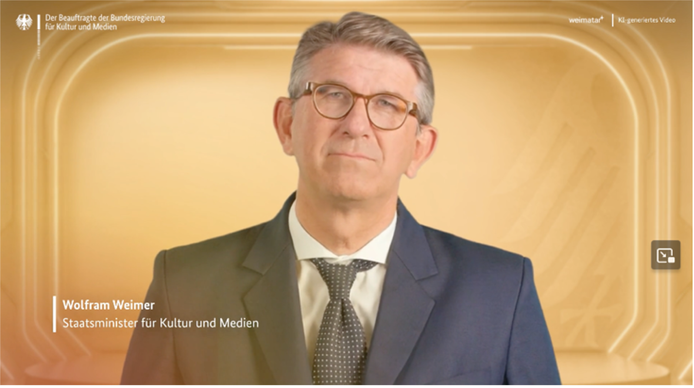 Staatsminister für Kultur und Medien Wolfram Weimer hat ein Experiment gewagt: In einem Video wurde der „Weimatar“ vorgestellt – ein KI-generierter Avatar des Staatsministers, der sich zu aktuellen Kultur- und Medienthemen äußert und dabei zwischendurch die Sprache wechselt.