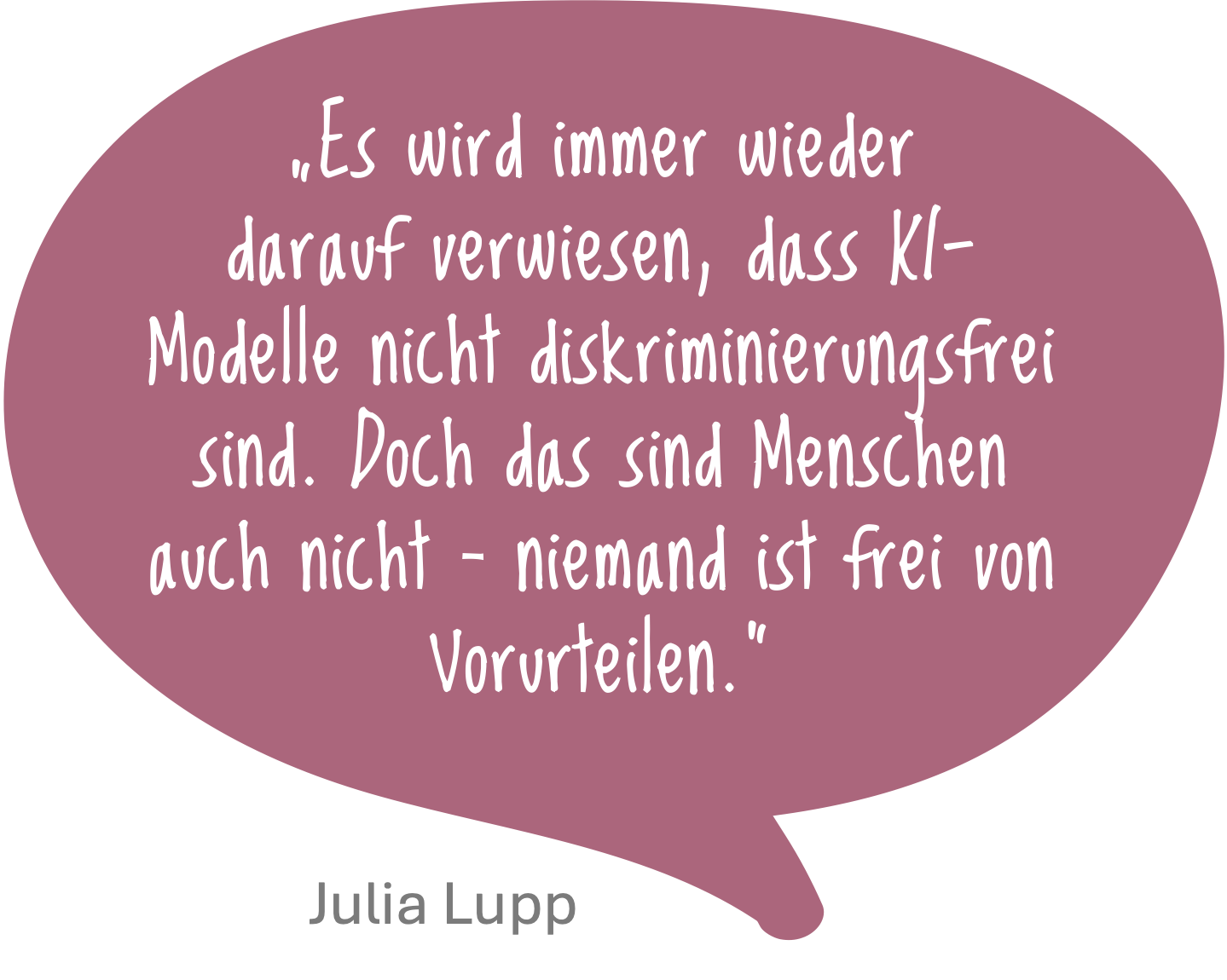 „Es wird immer wieder darauf verwiesen, dass KI-Modelle nicht diskriminierungsfrei sind. Doch das sind Menschen auch nicht – niemand ist frei von Vorurteilen oder Biases. Selbstverständlich ist es wichtig, dass KI nur eingesetzt wird, wenn es keine systematische Benachteiligung für bestimmte Gruppen gibt. Und transparent ist, auf welcher Basis und mit welcher Begründung entschieden oder eine Empfehlung ausgesprochen wurde. Auch hier wird sich in den kommenden Monaten und Jahren sehr viel tun.