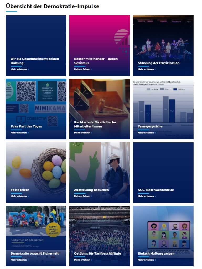 Die Kommunikation des Beschlusses erfolgte breit: Alle Mitarbeitenden erhielten einen Brief vom Verwaltungsvorstand, zusätzlich wurde mit einem Videoaufruf zum Mitmachen geworben. Ab April 2025 wurde die Umsetzung der Demokratie-Impulse dezentral organisiert – jedes Dezernat übernimmt für ein bis zwei Monate Verantwortung und bringt eigene Ideen ein.